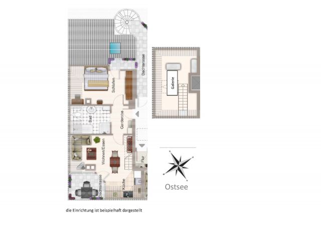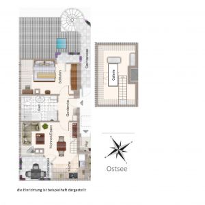 Unser "Penthouse Küstenzauber" bietet Ihnen auf insgesamt gut 60m² ein gemütliches Wohnzimmer mit Kaminofen, offener Küche und Essbereich - mit Zugang zur gemütlichen Dachterrasse, ein "Elternschlafzimmer" mit kleiner Loggia, ein schönes Badezimmer mit Dusche und Badewanne sowie weiteren 2 Schlafgelegenheiten auf der Galerie - auch hier mit einem direkten Ostseeblick. Weiterhin gehört zu unserem Penthouse Küstenzauber natürlich auch ein Parkplatz für Ihr Fahrzeug direkt am Haus.
